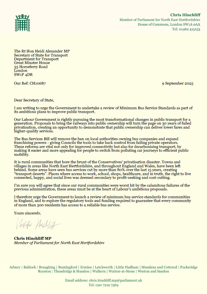 The MP for North East Hertfordshire has also written to the Secretary of State for Transport, Heidi Alexander MP welcoming the Labour Government’s transformational plans for public transport and calling for rural communities to be granted guaranteed bus services.